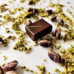 Discover the subtle blend of Bronte pistachio cream and our 36 % white chocolate. From the first bite, the roundness of white chocolate, contrasted by our dark chocolate, highlights the delicious taste of pistachio.