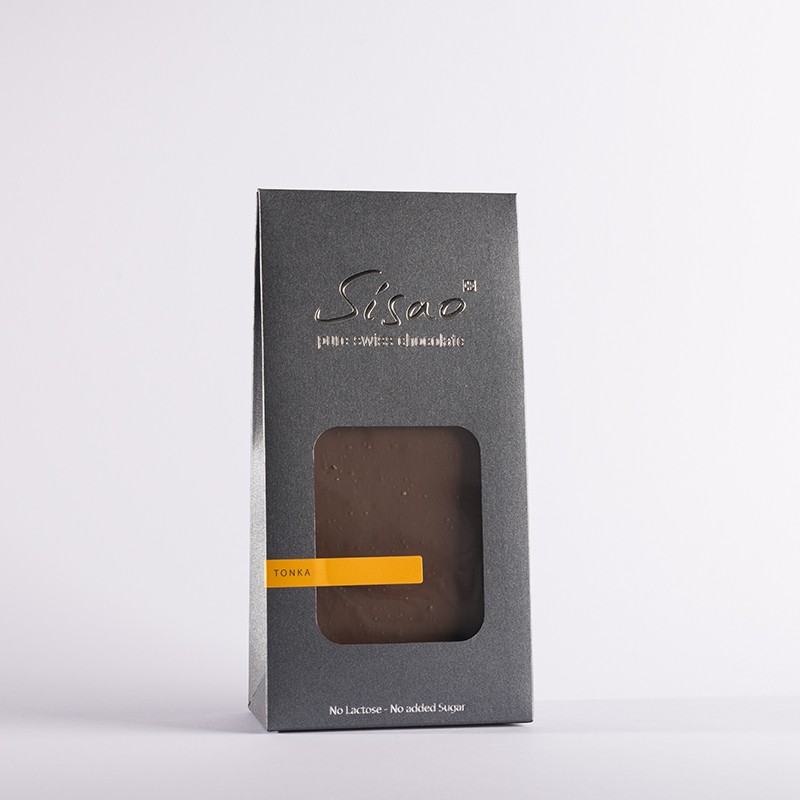 Fines feuilles de chocolat au lait (42 %) à la fève de Tonka (120 g).