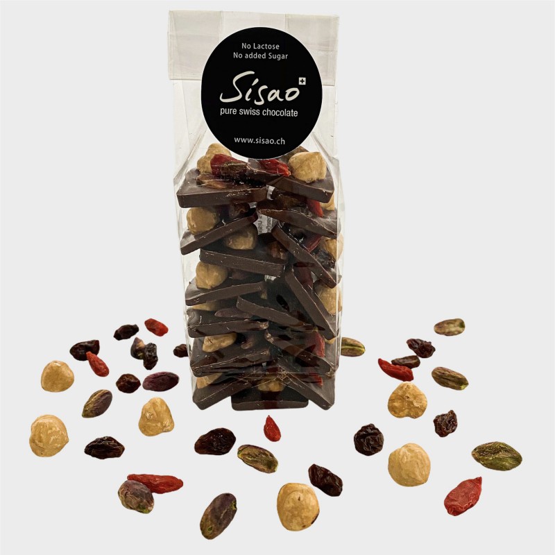Discover our 64 % dark chocolate, from Madagascar, sublimated with a Bronte pistachio, a Piémont hazelnut, a grape and a Goji berry.