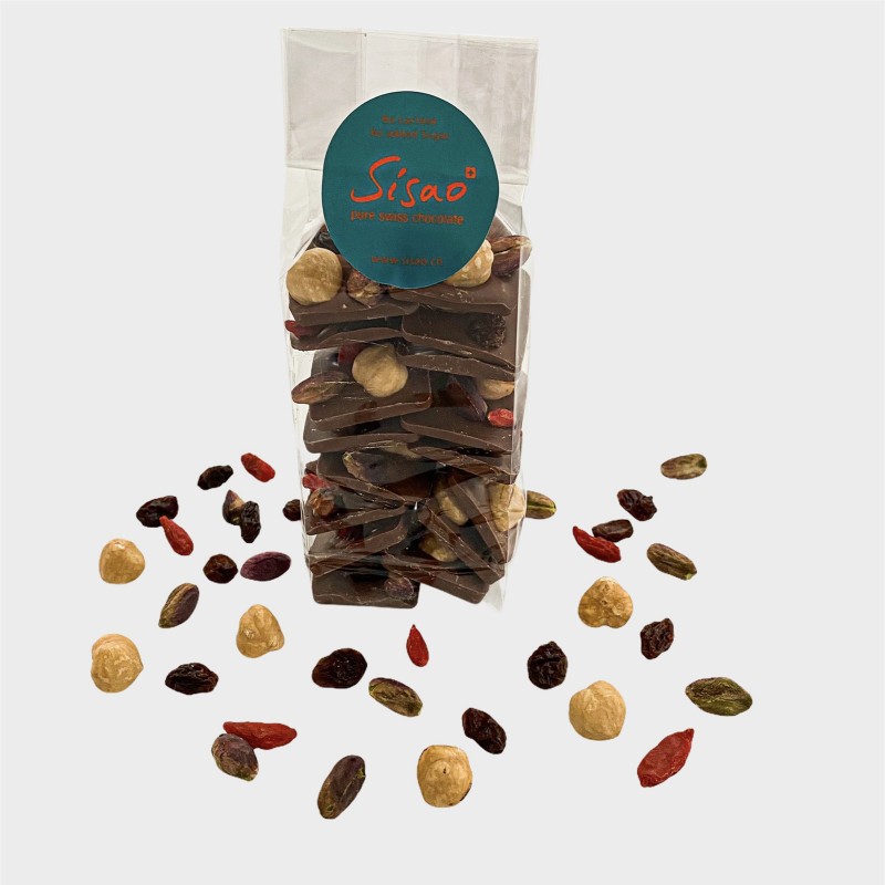 Discover our 42 % milk chocolate, from Madagascar, sublimated with a Bronte pistachio, a Piémont hazelnut, a grape and a Goji berry.