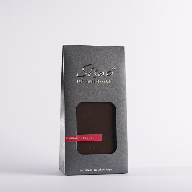 Fines feuilles de chocolat noir (64%) à la mandarine rouge d'Italie (120 g).