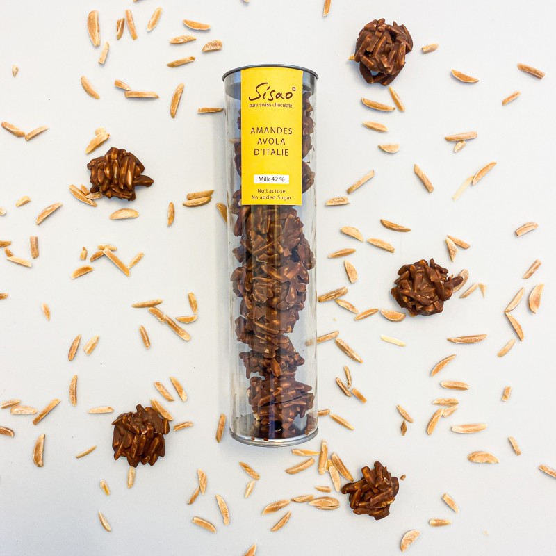 Découvrez le subtil mélange des amandes d’Avola torréfiées et de notre chocolat au lait 42 % origine Madagascar. Le croquant de l’amande associé à sa douceur se marie parfaitement à l’onctuosité de notre chocolat au lait.